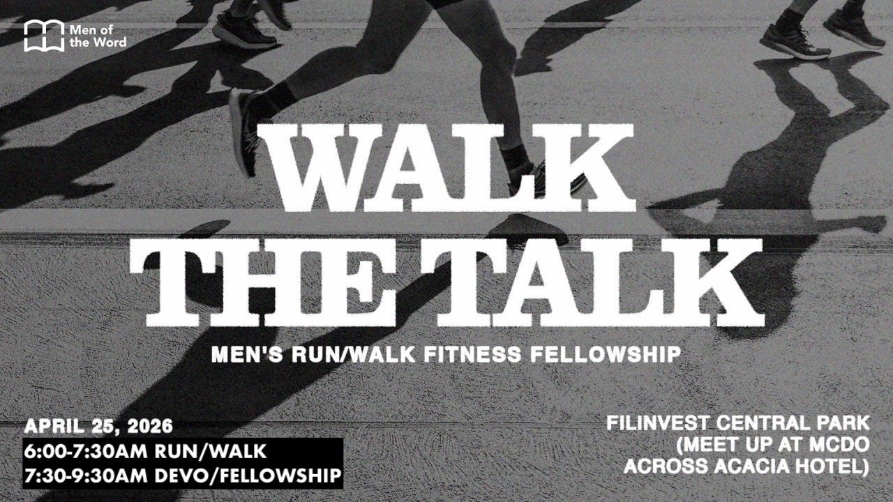 - Men of the Word would like to invite ALL MEN to again WALK THE TALK—A MEN’S RUN/WALK FITNESS FELLOWSHIP—NEXT SATURDAY ON APRIL 25, 6AM in Filinvest Central Park in Alabang. Meetup is at MCDO across Acacia Hotel.